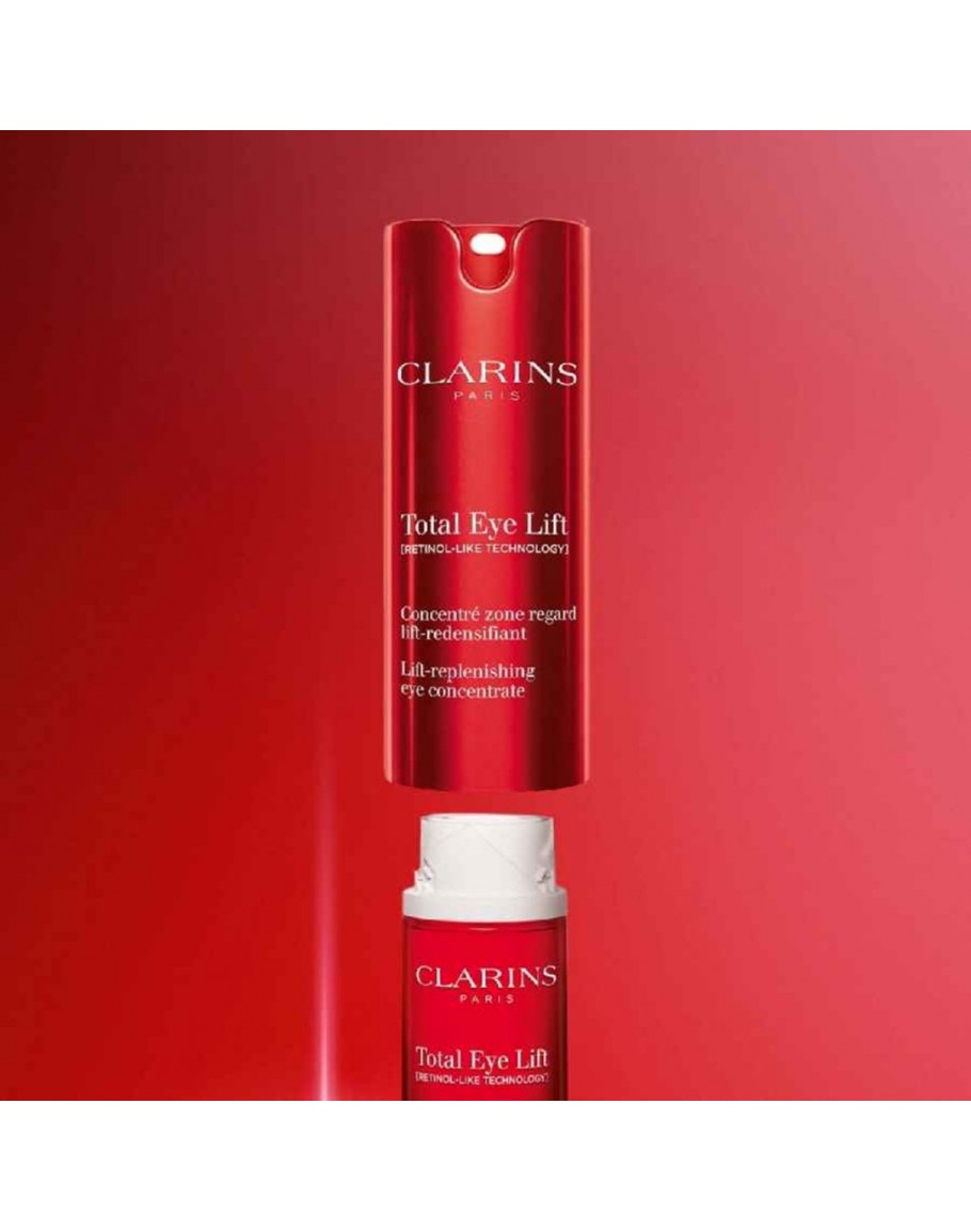 Tratamento global para o contorno dos olhos que incorpora a experiência "LIFT" da Clarins, concebido para realçar, suavizar e revitalizar visivelmente o olhar desde a primeira aplicação. A sua fórmula especializada atua nas pálpebras, olheiras e rugas, conferindo firmeza e luminosidade à zona. Total Eye Lift é o tratamento especializado que transforma visivelmente o olhar em apenas 30 segundos*, graças a uma dupla inovação em ciência e fórmula. Incorpora a [RETINOL-LIKE TECHNOLOGY], com um potente extrato de harungana bio tão eficaz quanto o retinol** e suave para o contorno dos olhos. Este ativo, com eficácia patenteada***, potencia a produção de colagénio x12****. Combina-se com um novo extrato de Jania vermelha proveniente da biotecnologia para um efeito lifting de longa duração. A sua textura em bálsamo forma uma rede tensora sobre a pele (PRO-TIGHTENING MATRIX) para um efeito lifting imediato, cuja eficácia foi comprovada através de um novo protocolo de teste real da Clarins. Formato recarga*****.